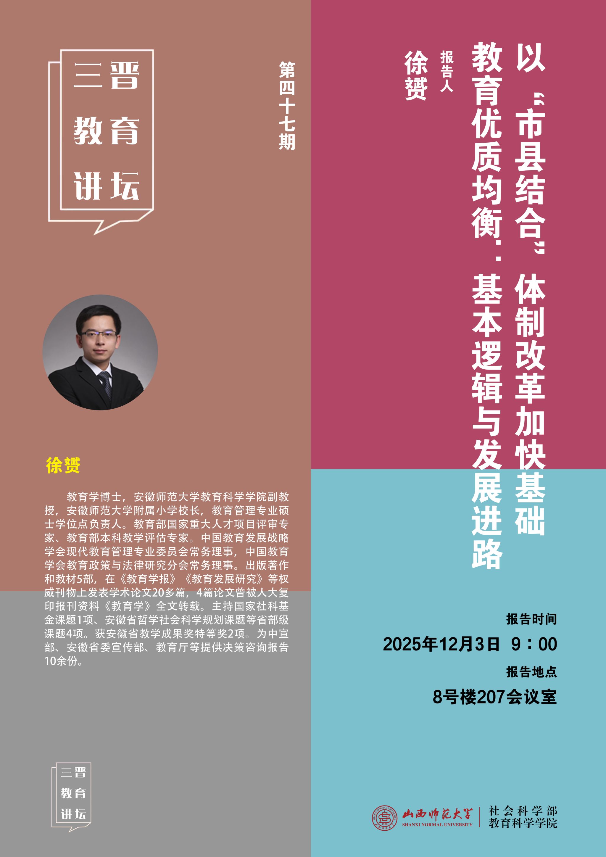 【预告】安徽师范大学附属小学校长、教育科学学院副教授徐赟应邀来我院作学术报告