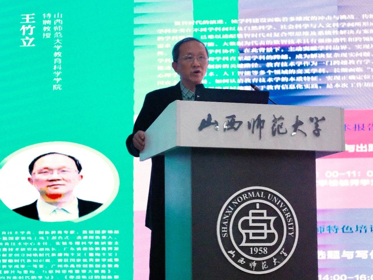 本次工作坊的主题为《数智时代的课程、教学与教育技术学的学科建设》,分两个环节。在学术报告环节,王竹立教授面向学院师生作了题为《数智时代的教育技术——挑战、机遇与出路》的专题报告,就教育技术学的学科性质、现存问题与时代机遇等进行了深刻阐释,并创新性的提出了“超学科”这一新兴学科发展范式。在研究生指导教师特色培训环节,王竹立教授以《学术论文选题与写作》为题,围绕从兴趣和实践出发选题、面对真实问题且紧跟时代前沿开展研究、零存整取厚积薄发的写作方法、坚持独立思考敢于质疑与批判等内容,与导师们展开了深入交流,并从文章题目、核心概念、研究方法、观点呈现等维度就导师们提出的问题给予了富有针对性的意见与建议。