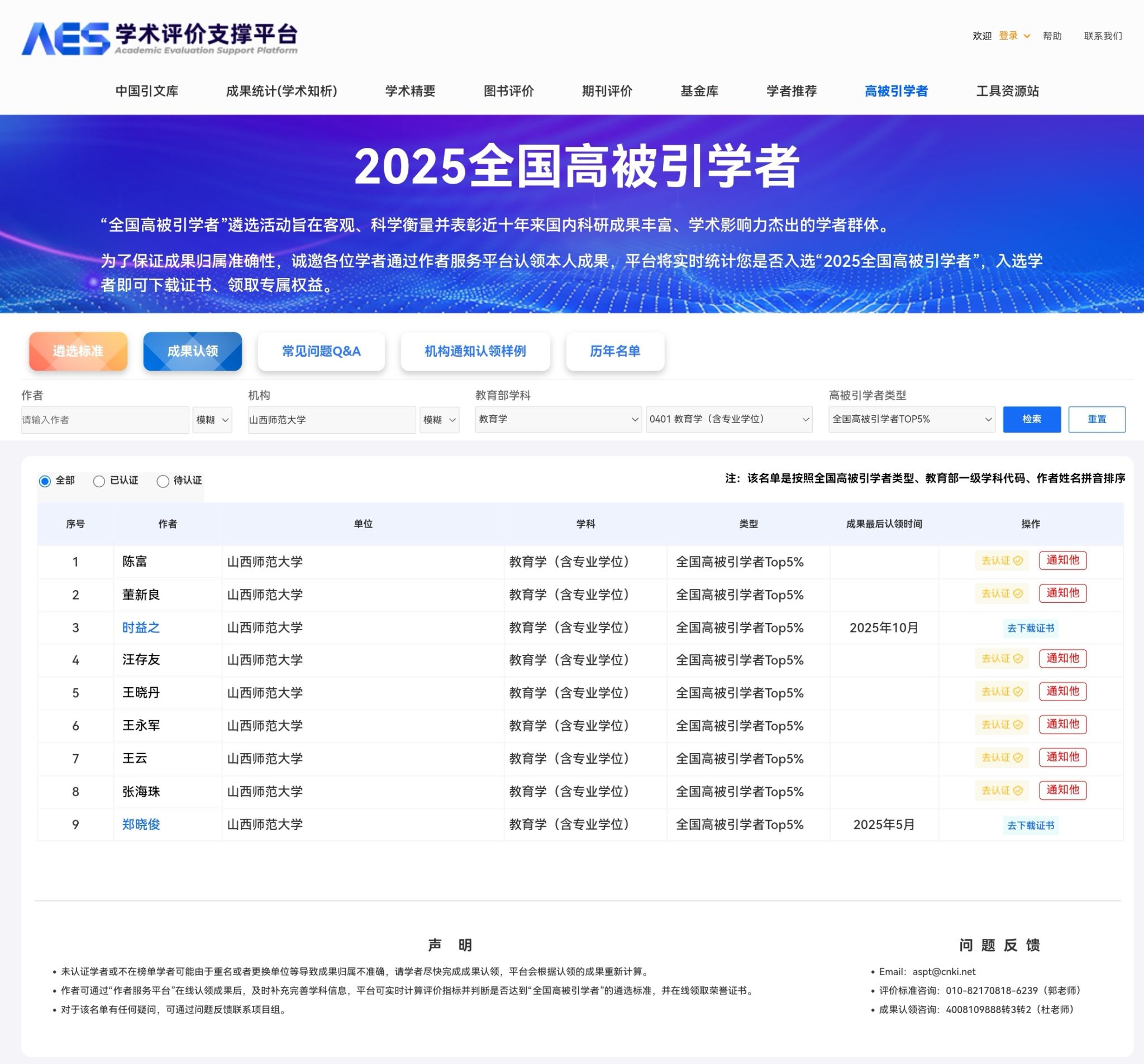 近日,中国知网下属的中国科学文献计量评价研究中心发布了“2025全国高被引学者”榜单。我院教育学学科共15位教师入选,较上年增加了3人,增幅达25%。其中,6位教师入选“全国高被引学者TOP1%”,9位教师入选“全国高被引学者TOP5%”,从一个侧面彰显出我院教师对教育科研与学科发展的贡献和学术影响力。